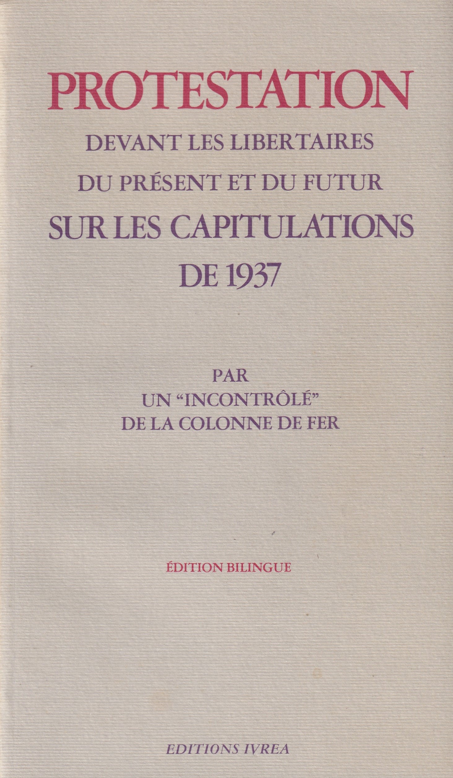 Protestation devant les libertaires du présent et du futur sur les capitulations de 1937 INCONTROLE DE LA COLONNE DE FER (un) Publié en : 1995